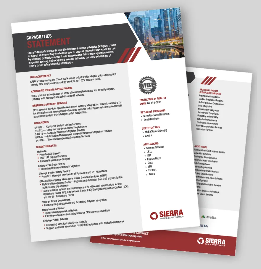 Sierra Public Safety Group delivers pragmatic solutions, innovative thinking, and exceptional services tailored to the unique challenges of today’s public safety technology landscape.